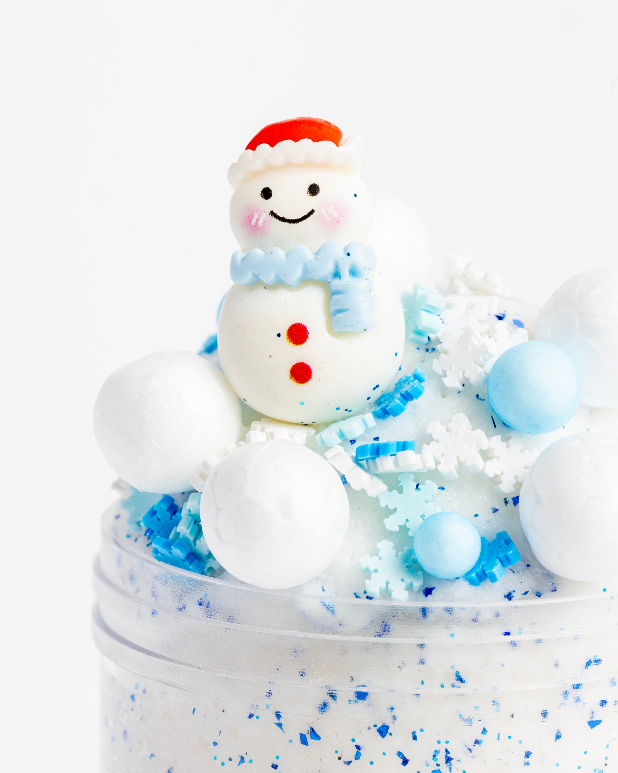 This cloud white slime, scented like birthday cake, is topped with colourful sprinkles, playful floam balls and a cute snowman charm perfect for festive, sensory play.