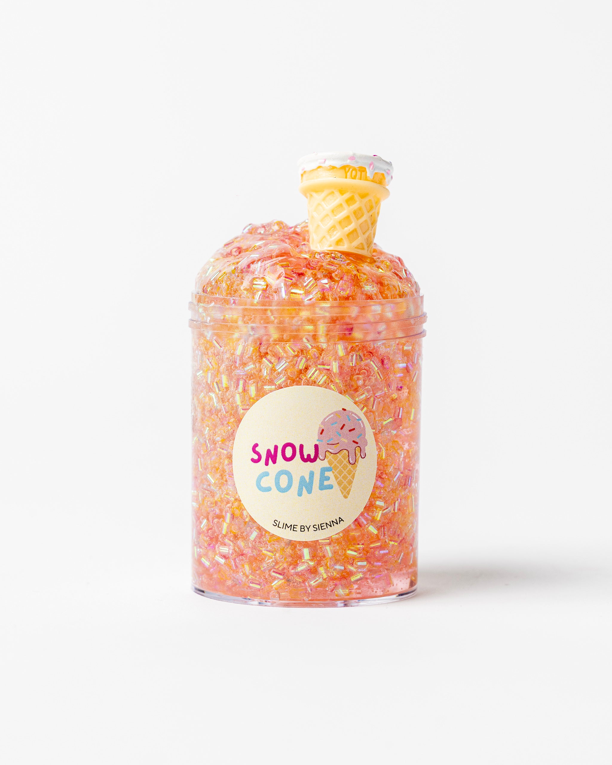 Snow Cone is a clear pigmented slime mixed with bingsu beads for fun, crunchy texture topped with a cute charm.