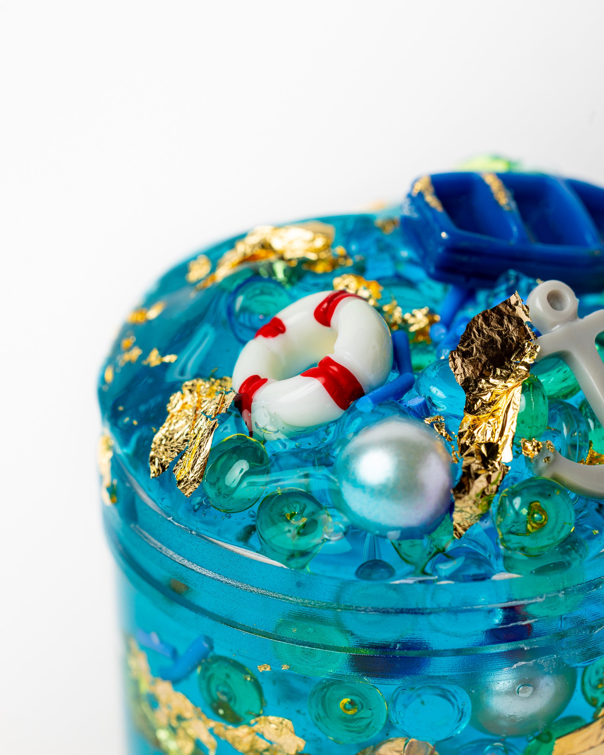 Under The Ocean is a clear pigmented slime inspired by ocean vibes. Smooth, glossy and super satisfying. It's finished with cute ocean themed add ins for the perfect underwater look.