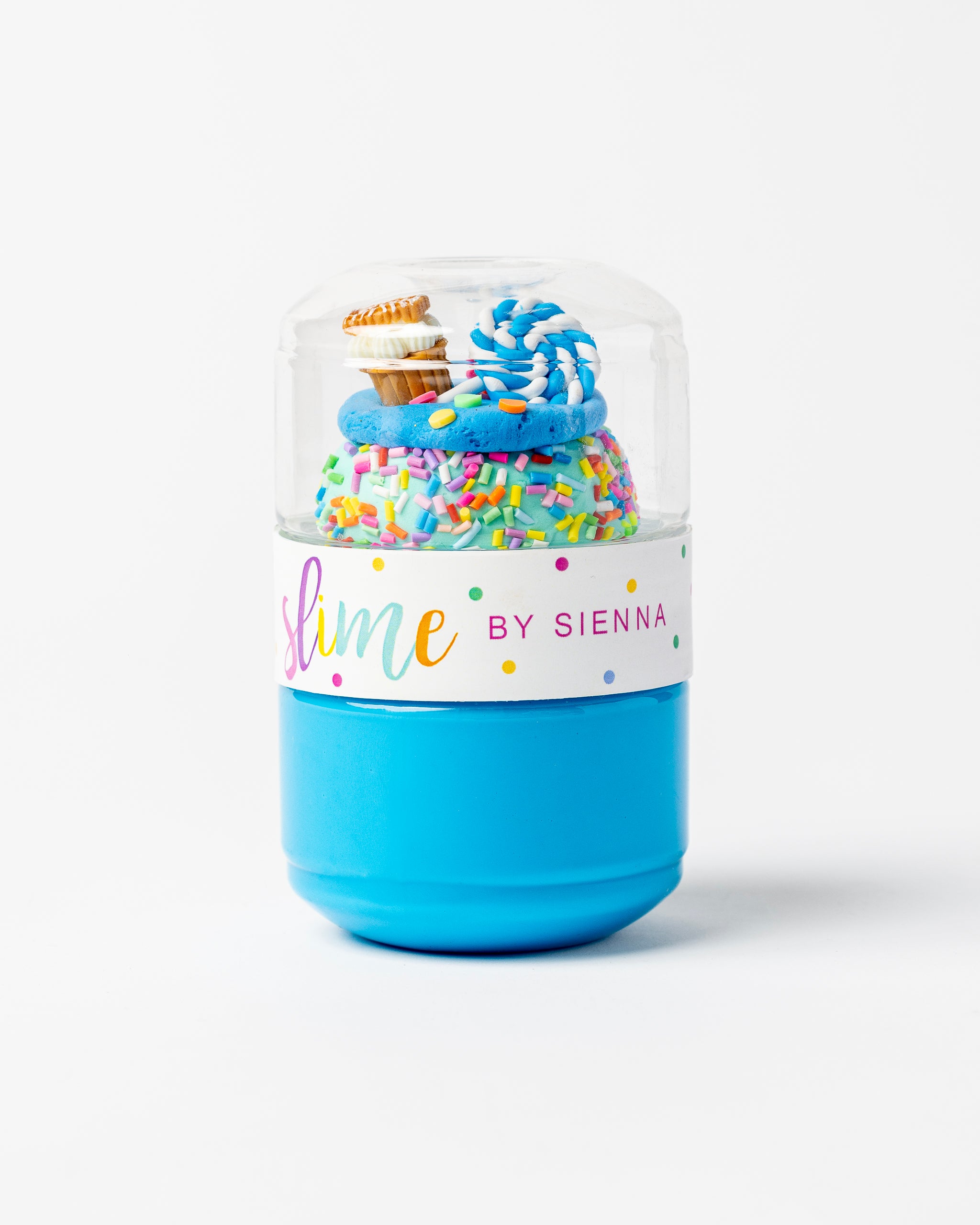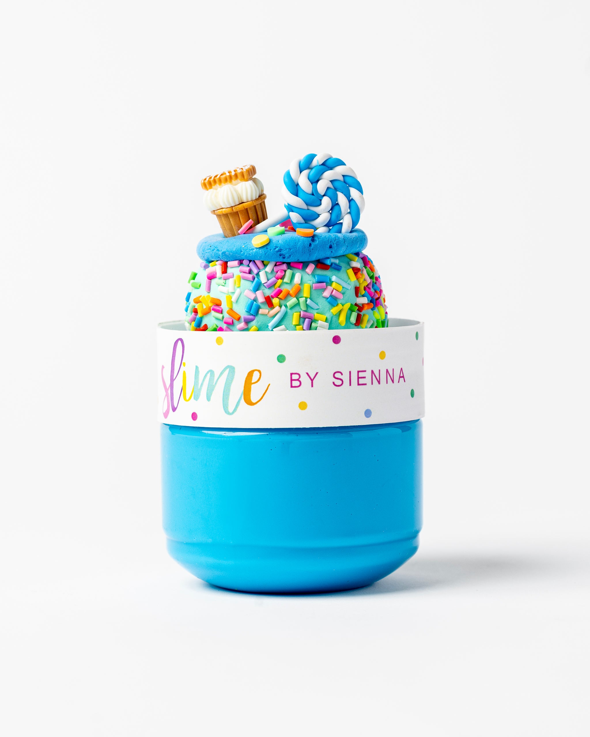 A super cute container filled with blue thick & glossy slime on the bottom and ice cream inspired clay to mix into your slime for a butter consistency with sprinkles and charms on top!