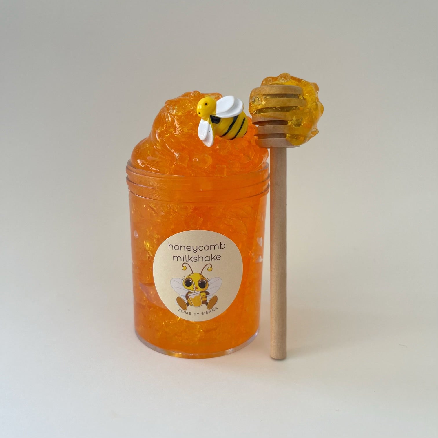 4.5 oz Honeycomb Milkshake clear pigment base slime. Comes with a super cute honey wooden spoon and a bee charm.
