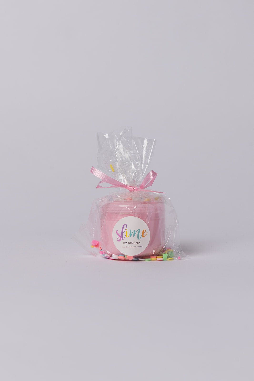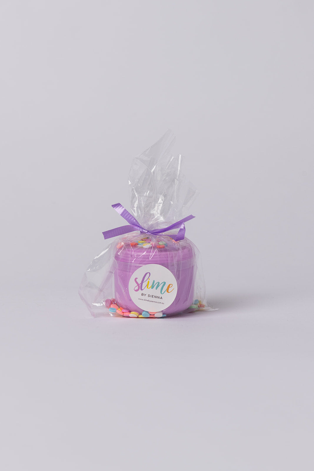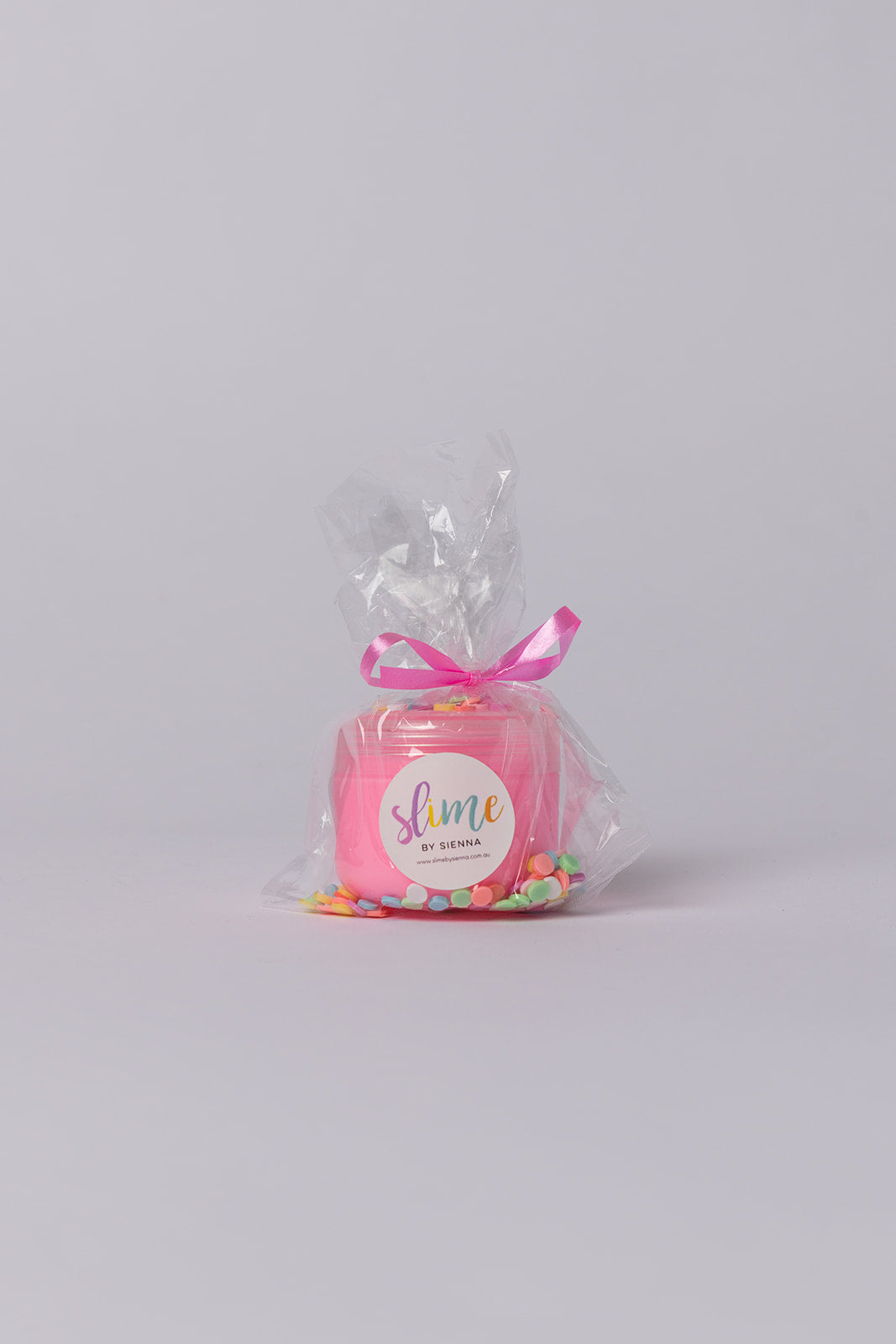 A 2.5oz container filled with slimes, sprinkles, packed in a cellophane bag with ribbon.