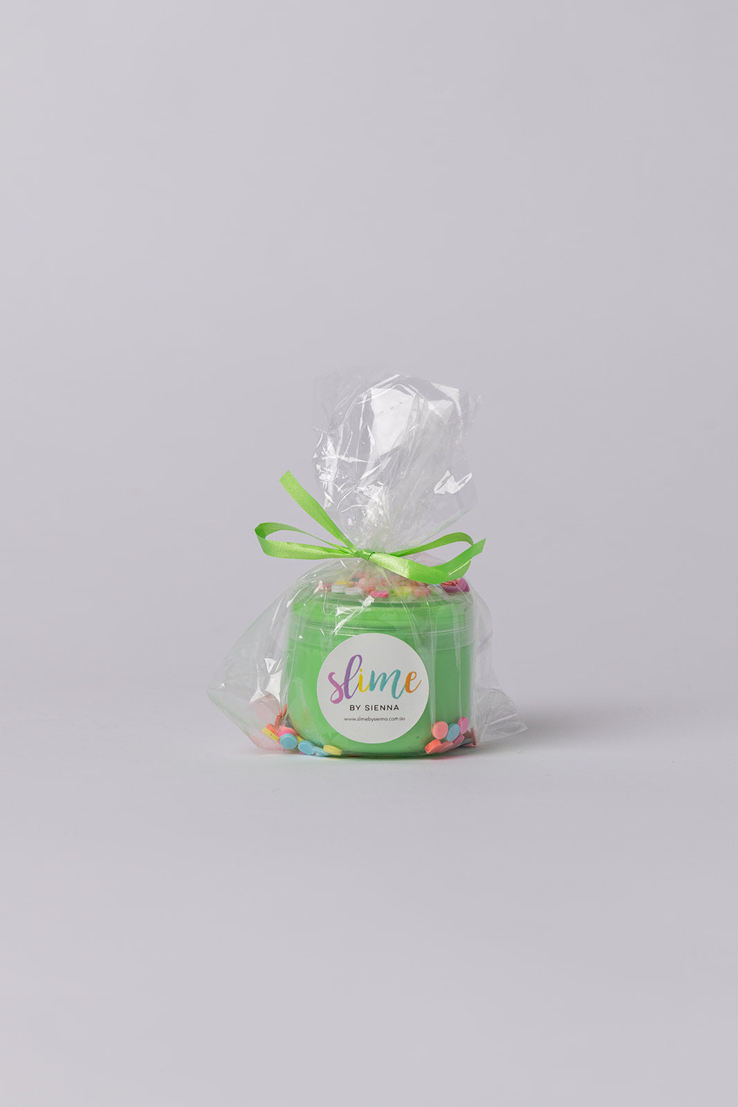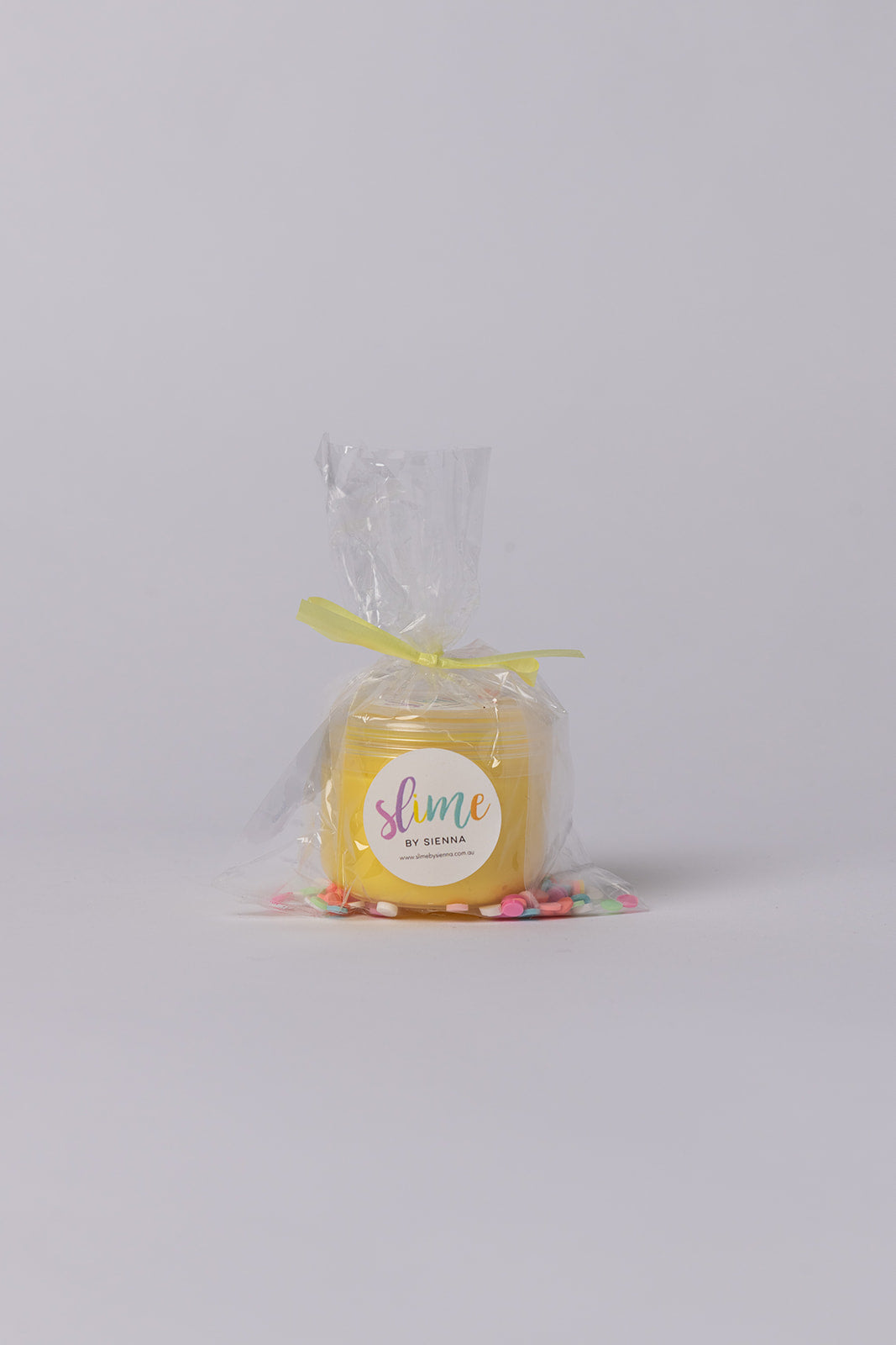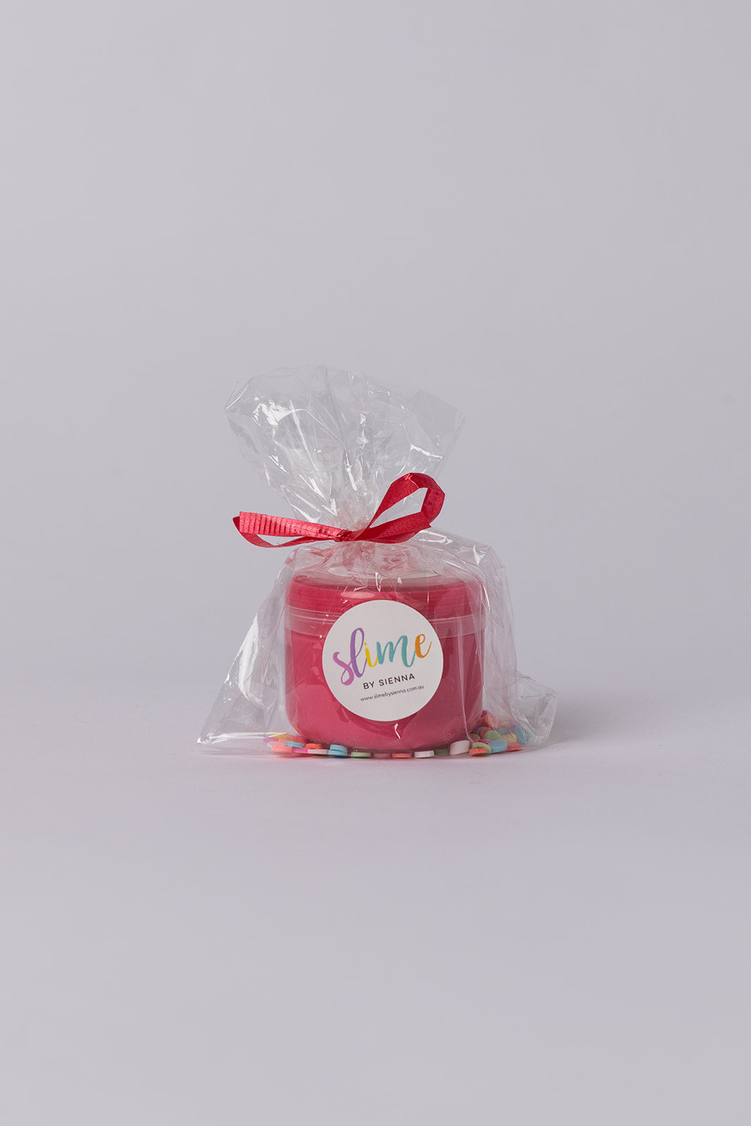 A 2.5oz container filled with slimes, sprinkles, packed in a cellophane bag with ribbon.