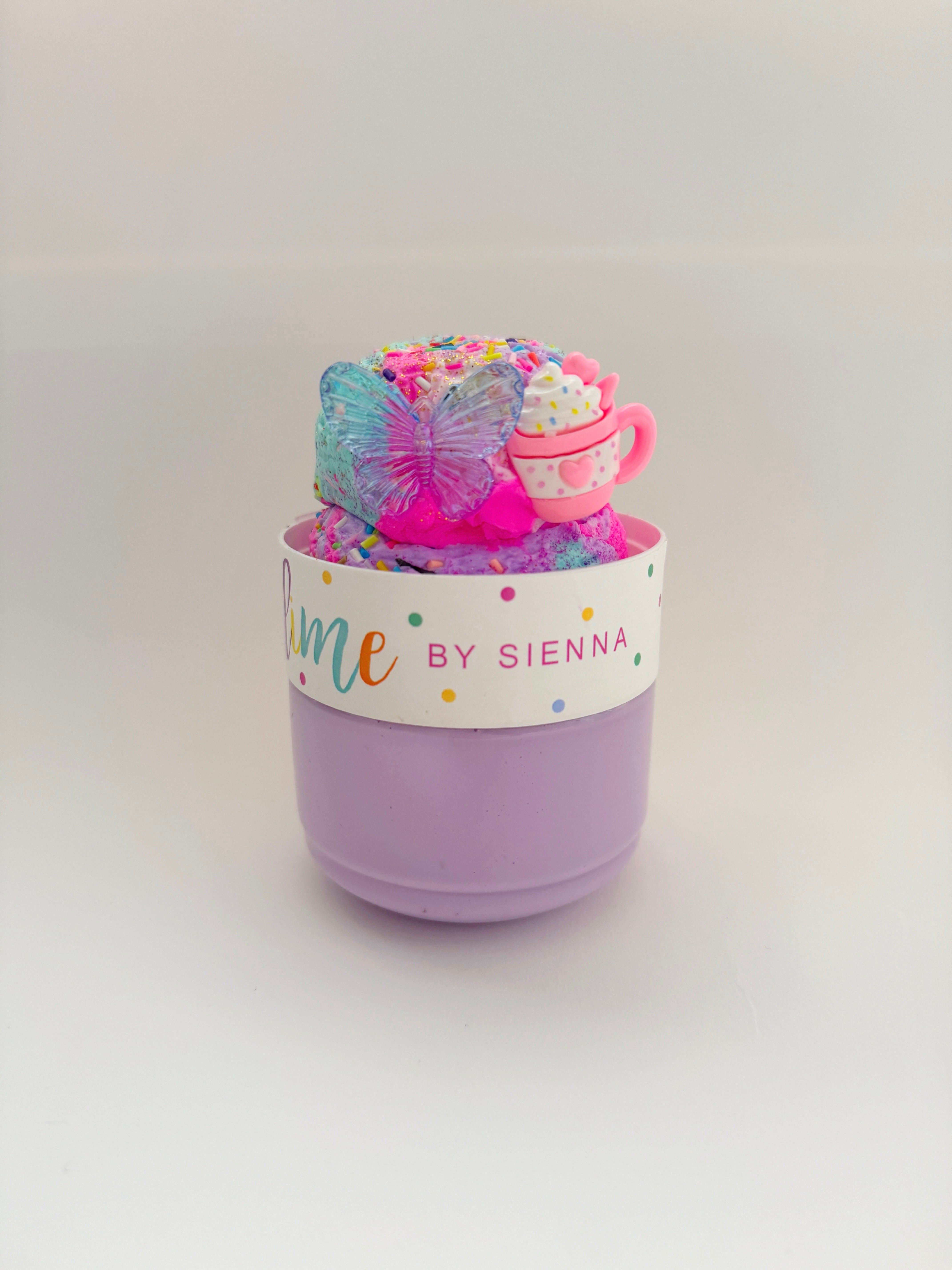 A super cute container filled with slime on the bottom and clay to mix into your slime for a butter consistency with sprinkles and charms on top!