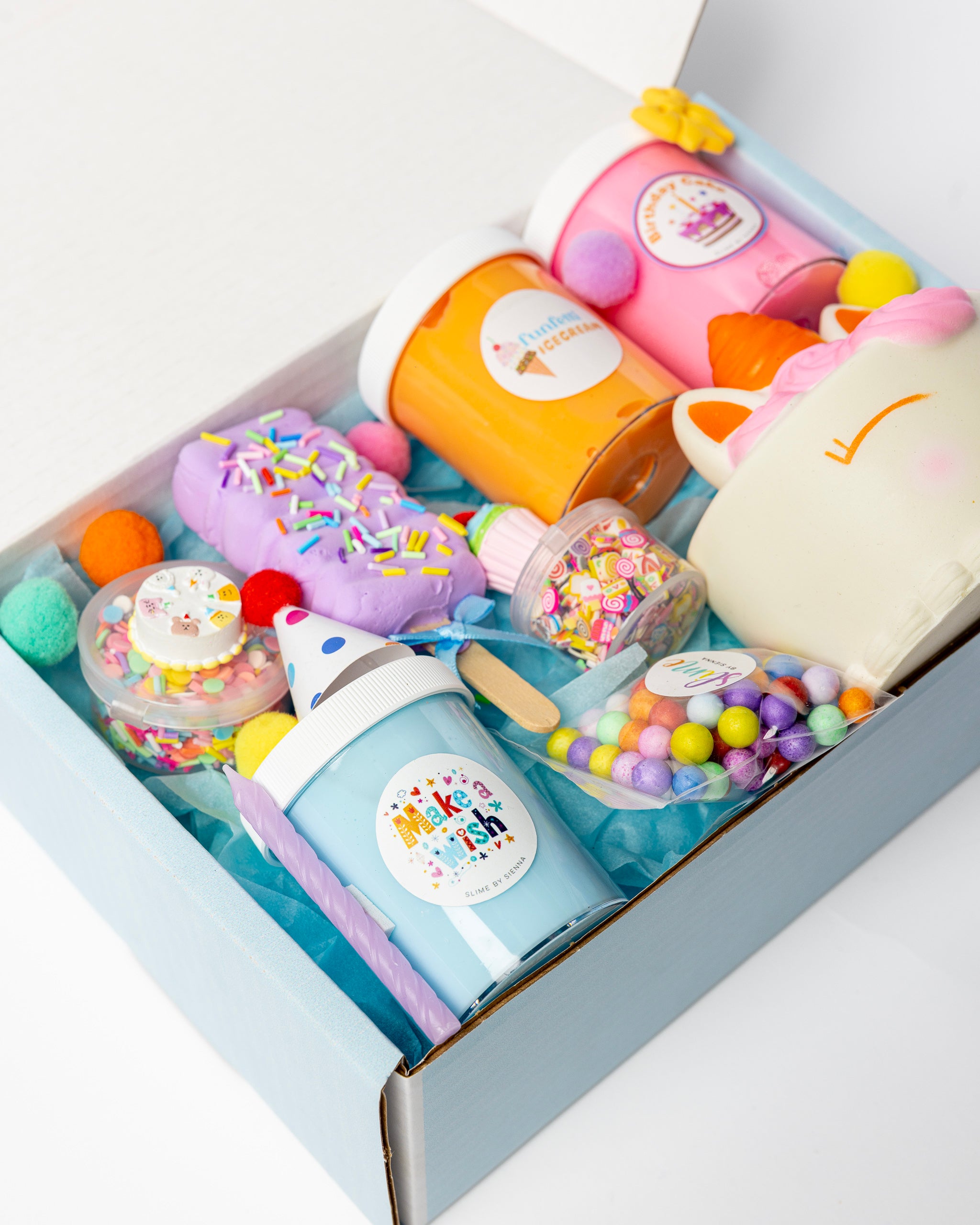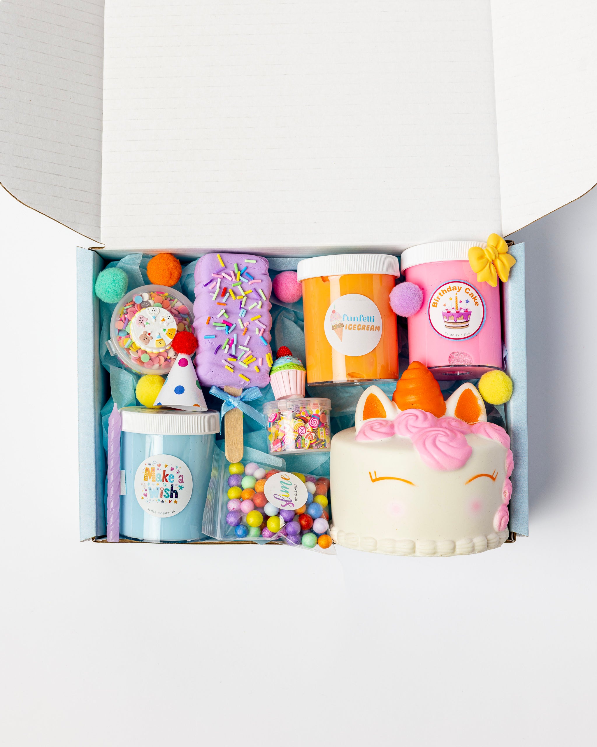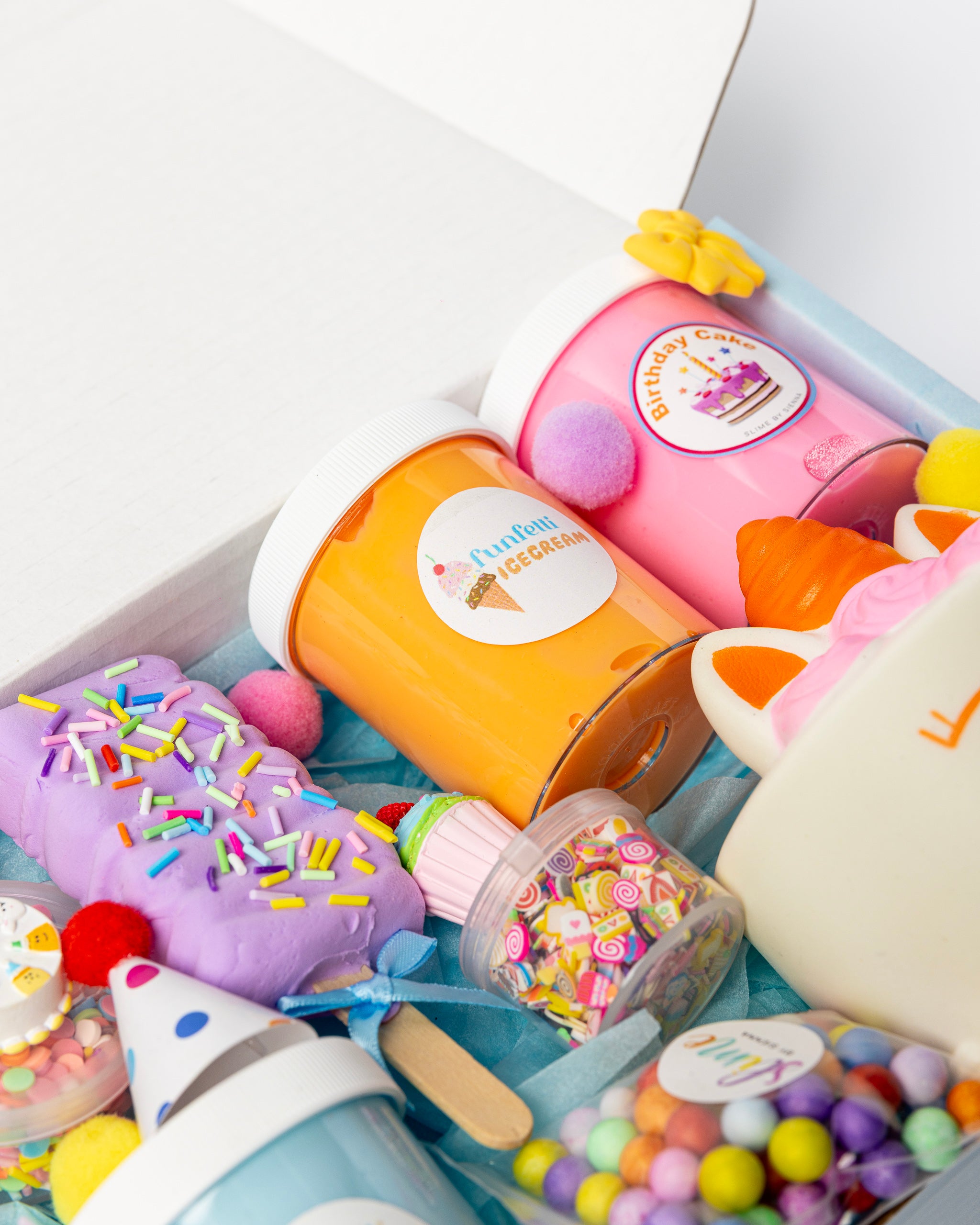 Celebrating big with our Mini Mega Birthday Box! Packed with a mix of thick and glossy slimes, fun add ins, a clay popsicle to mix into your slime and a super cute cake squishy. It's everything a slime lover could dream of.