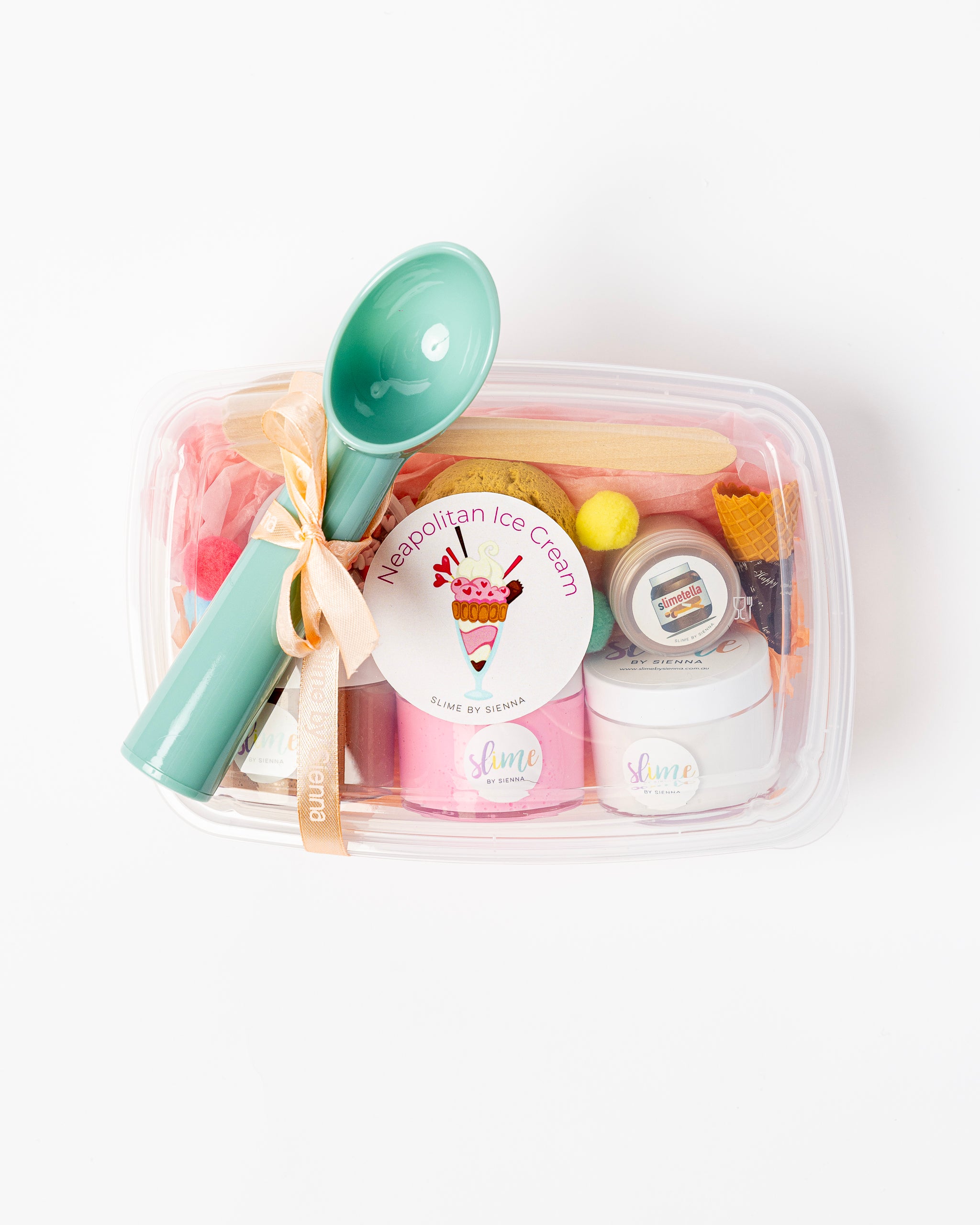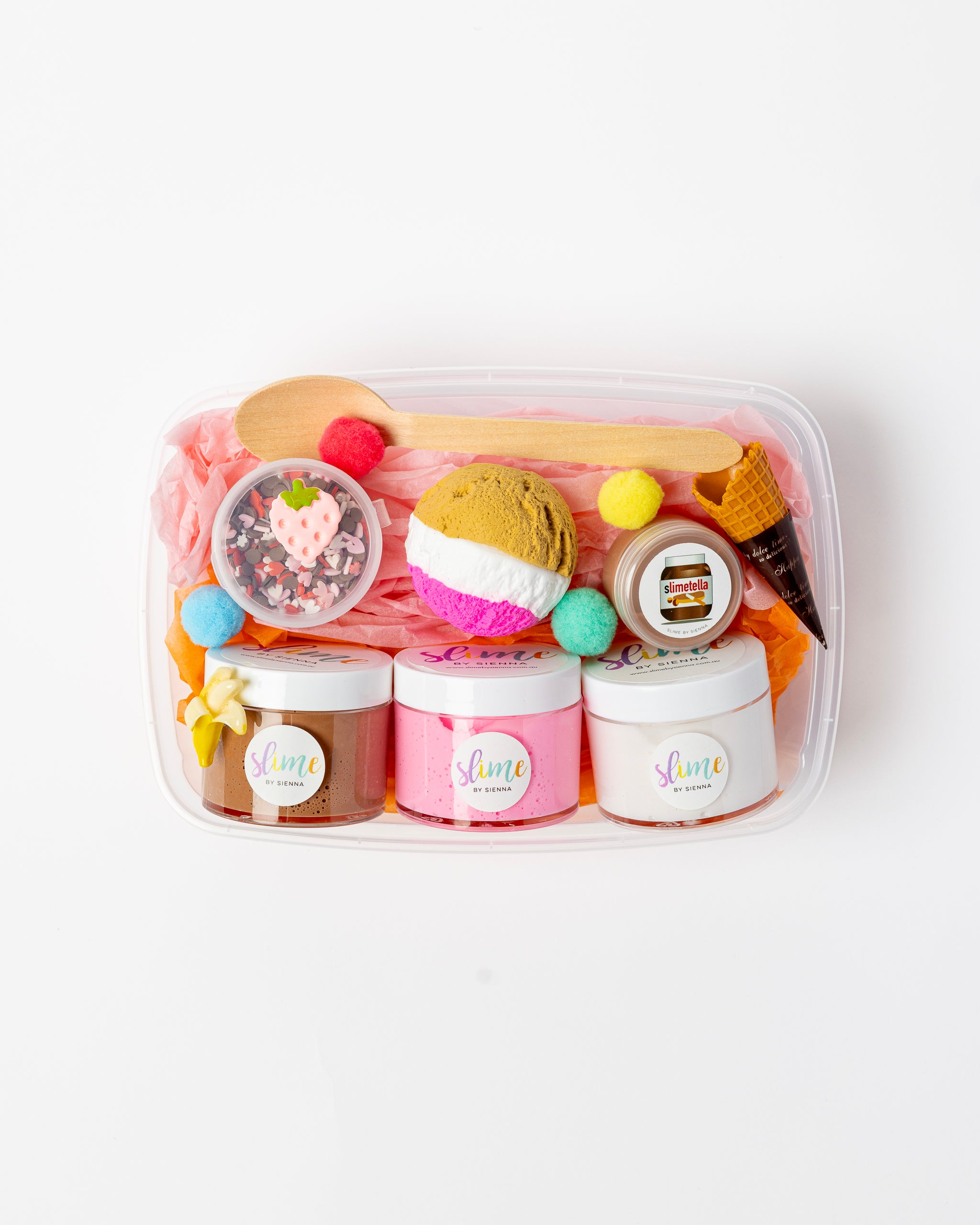 This gorgeous ice cream pack comes with three pots of scented and textured slimes in pink thick & glossy, chocolate cloud texture and white is a butter fluffy slime