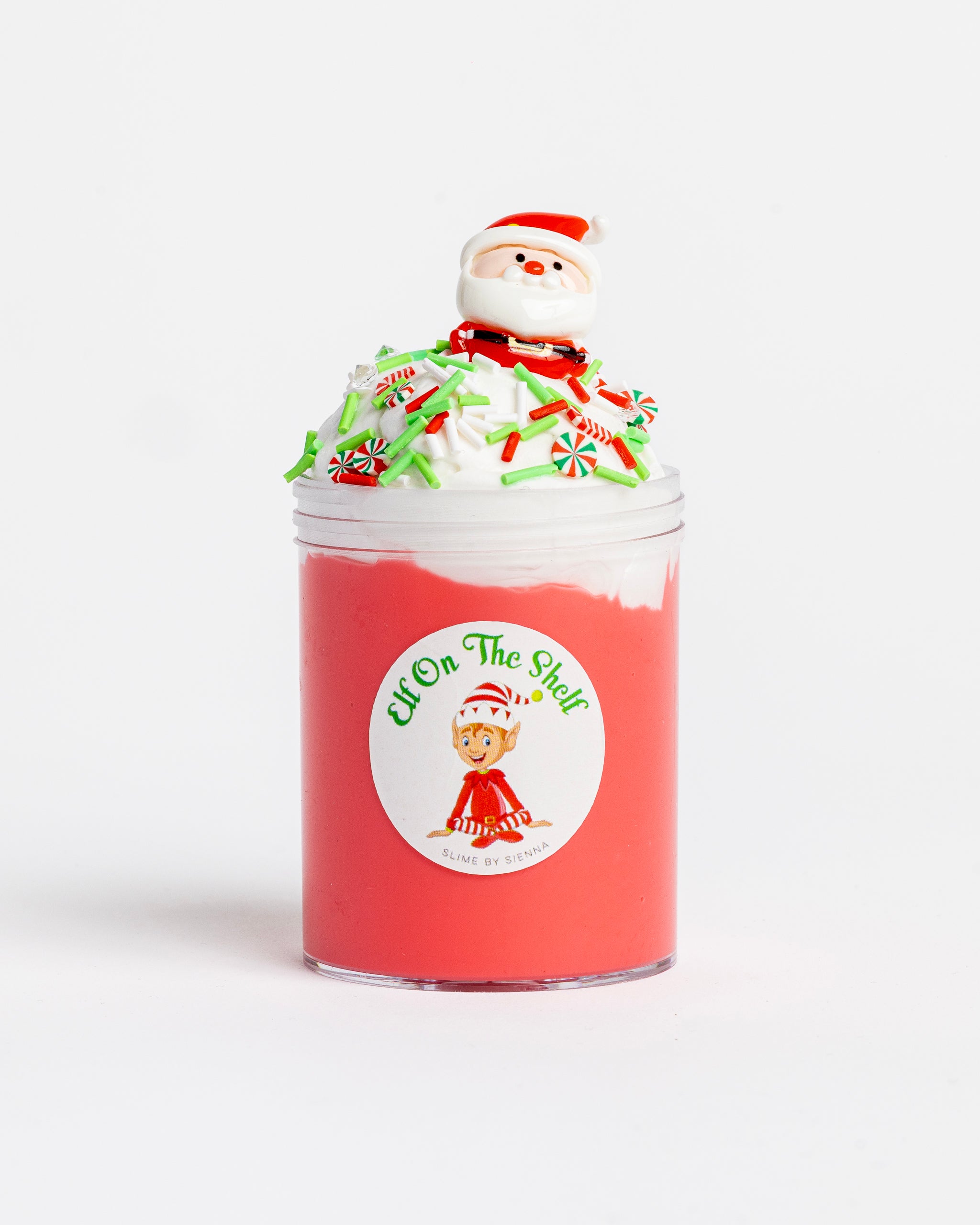 Our cheeky Elf on the Shelf slime is full of festive mischief and Christmas magic! This bright and playful slime is topped with soft white clay for a smooth, buttery texture and finished with colourful sprinkles and a Santa charm.