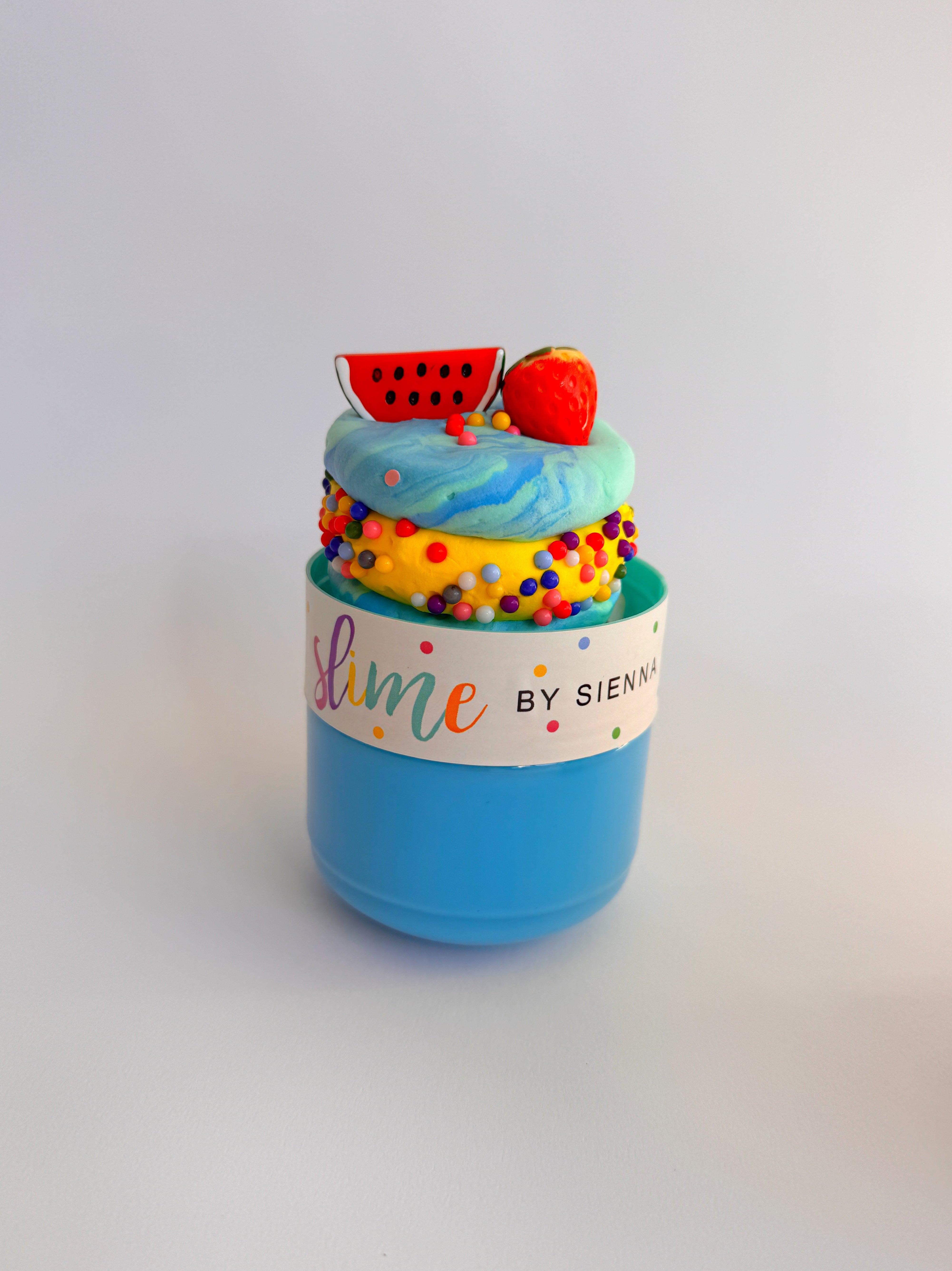 A super cute container filled with slime on the bottom and clay to mix into your slime for a butter consistency with sprinkles and charms on top!